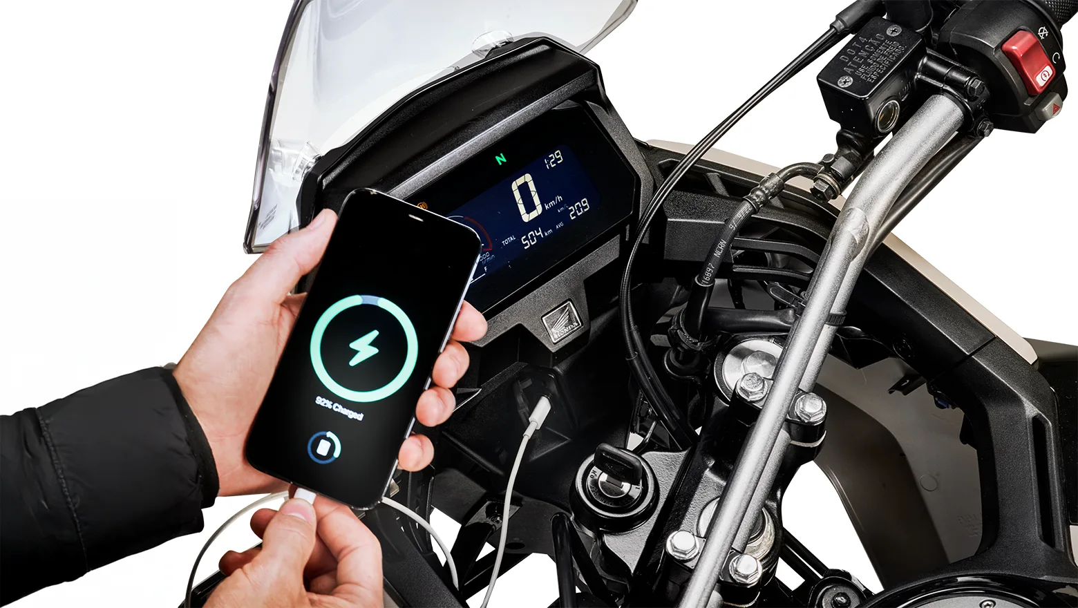 Com tecnologia de última geração, a incrível Honda Sahara 300 é equipada com entrada USB-C, que garante carregamento rápido e proporciona mais praticidade para as suas experiências na estrada.